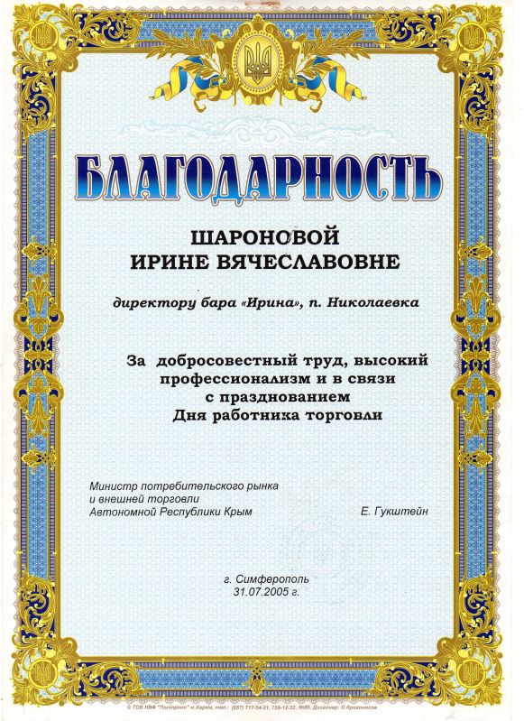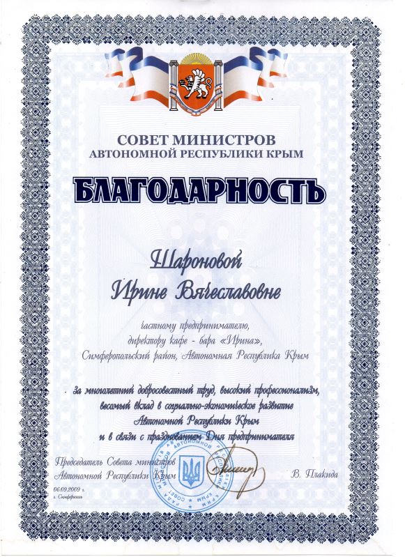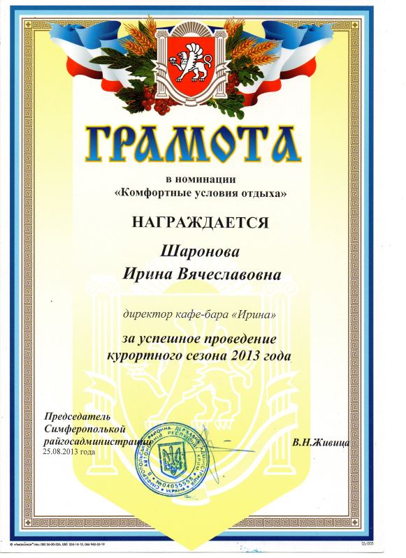 Главными показателями качества работы гостиницы являются мнение гостей об уровне отдыха здесь и награды, полученные за добросовестный труд. Отель Николаевки Крым с бассейном «Ирина» может похвалиться и тем, и другим. Не раз гостиница получала дипломы и грамоты, свидетельствующие о её вкладе в развитие курортно-туристической отрасли полуострова. Отмечаются высокий уровень сервиса отеля, профессионализм его работников и владельцев. Не остался в стороне и одноимённый кафе-бар, который помимо ежедневной качественной работы, отличился на некоторых кулинарных конкурсах.